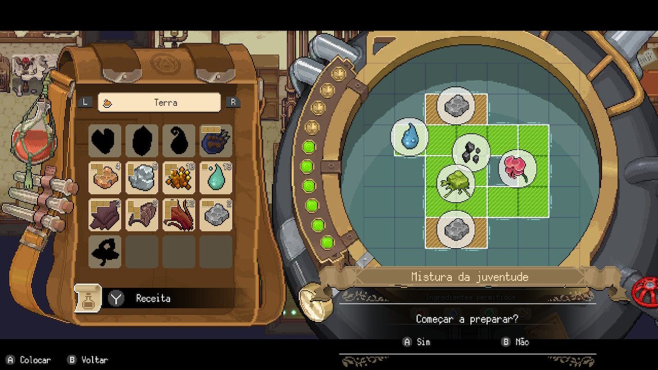 A produção dos elixires funciona como um puzzle, no qual devemos encaixar os ingredientes nos espaços vazios de um quadro. É importante destacar que cada receita e cada ingrediente possuem formas distintas, o que torna algumas poções um pouco mais complexas de se preparar, já que todos os quadradinhos devem ser preenchidos.